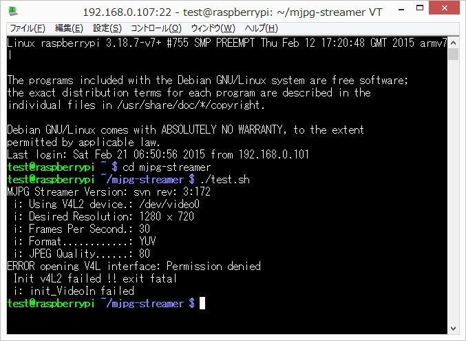 ./test.shusermodコマンドでvideoグループに参加させる必要があった。