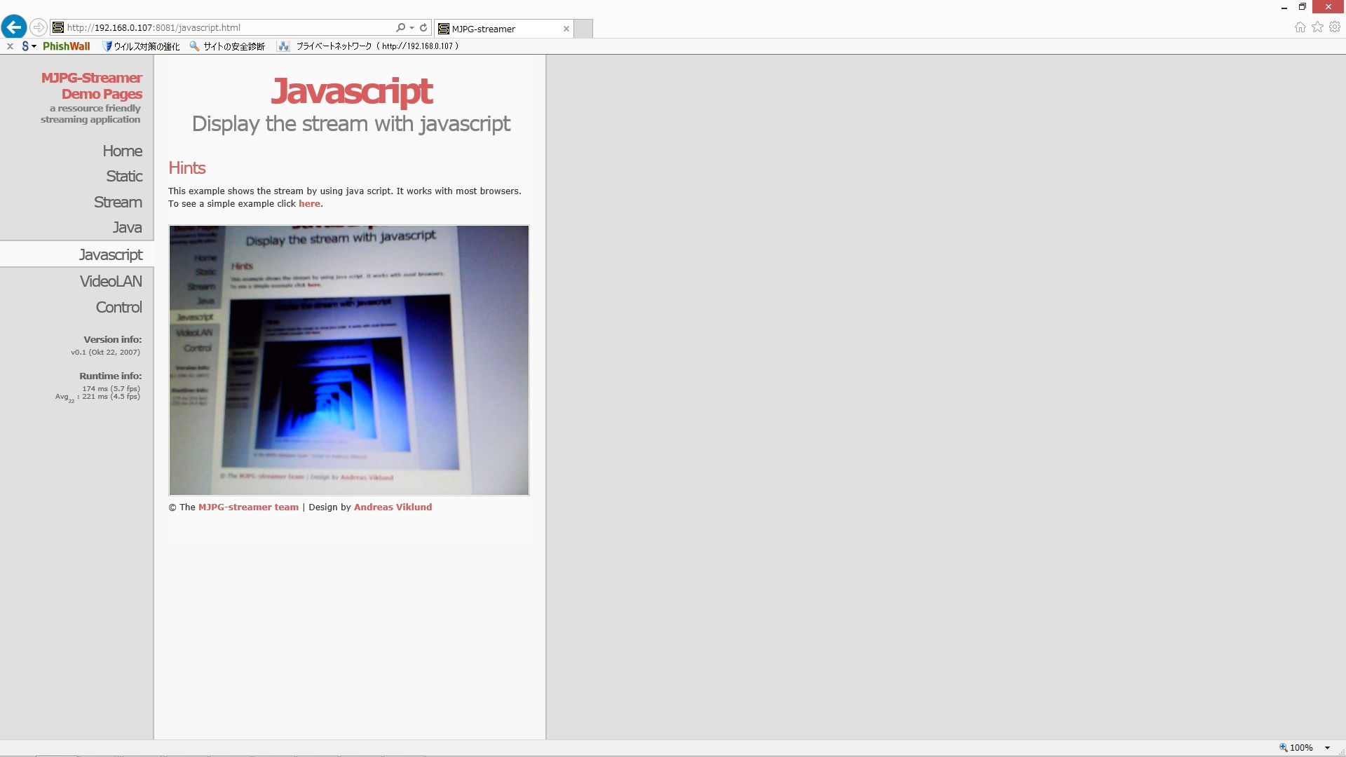 MJPG-streamerはMotion-JPEG直、Javaアプレット経由の配信以外にJava Scriptで静止画を連続で取得させて動画を配信する機能がある。