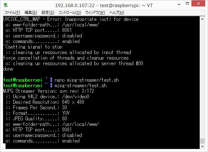 -o "output_file.so -d 500 -f /home/test/mjpg-streamer"今回はやらなかったけどカメラが対応してる場合はコンパイル時にUSE_LIBV4L2=trueてすると解像度の選択肢が増えるらしい。