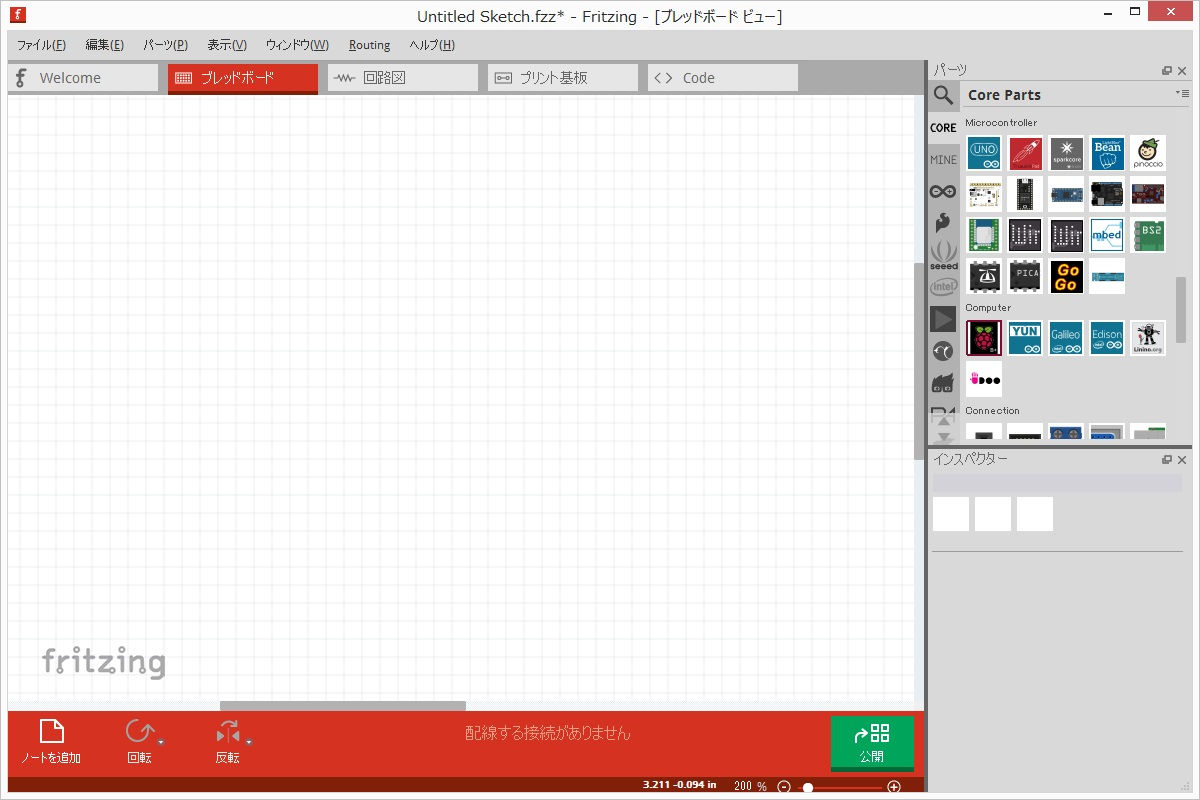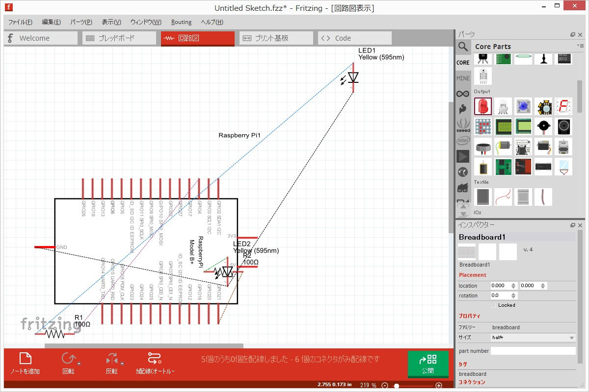 ブレッドボードタブにパーツを配置していく。パーツペインからパーツを選んでドラッグするだけ。