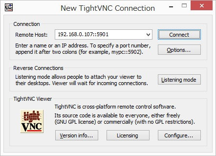「接続先::ポート番号(5900+リモート番号)」を入力してConnectボタン。